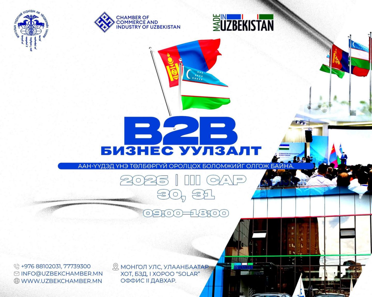 2026-03-092026-03-09 МҮХАҮТ – CHAMBER OF COMMERCE AND INDUSTRY OF UZBEKISTAN – аас хамтран зохион байгуулж буй MADE IN UZBEKISTAN төслийн хүрээнд B2B Бизнес уулзалтыг 2026 оны 03 дугаар сарын 30,31- ны өдөр зохион байгуулах гэж байна. Тус ажлын хүүрээнд ААН – үүдэд үнэ төлбөргүй оролцох боломжыг олгож байна. Хаяг : Монгол улс, УБ хот, БЗД 1-р хороо, “SOLAR OFFICE” 2 давхар. Share
